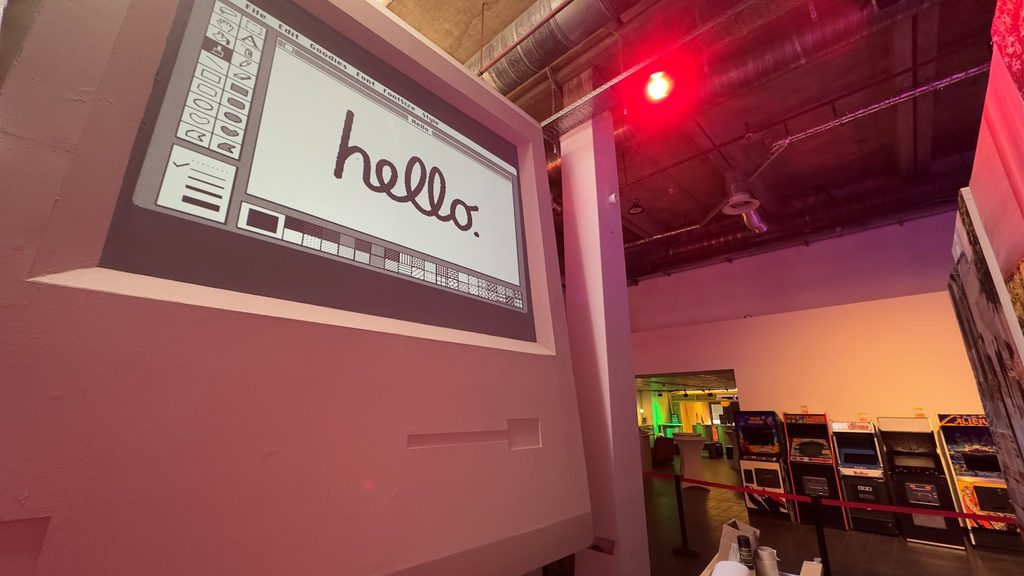 Die Zeitreise beginnt 1976 mit einer nachgebauten Apple-Garage, bei den Eltern von Steve Jobs, dem Ausgangspunkt von allem. Dann geht es weiter zur West Coast Computer Faire 1977, wo Apple den Apple II der Welt vorstellte. Und dann kommt das Herzstück der Ausstellung: ein begehbarer Macintosh im Maßstab 14 zu 1. Fünf Meter hoch, mit einem Macintosh-Mainboard als bedruckter PVC-Folie auf dem Boden. Man läuft also buchstäblich durch die Platine des Originals. Auf der Rückseite sollen – wie beim echten Mac von 1984 – die Unterschriften des Entwicklerteams zu sehen sein. Als Relief herausgearbeitet und mit Licht von unten angestrahlt, damit die schön plastisch wirken.