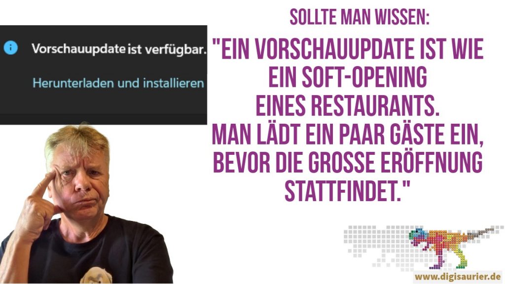 „Hannes, eine schnelle Frage bevor Du gleich irgendwo in einer Wellness-Welt verschwindest: Was ist ein Vorschauupdate bei Windows? Klingt nach Beta, oder? Muss man vielleicht also gar nicht machen…? Sollte man aber vielleicht…? Ich dachte, vielleicht macht das ein paar Bugfixes, die besonders rasch gelöst werden müssen? Sonst gibt es ja den Patchday, aber das ist ja offenbar was anders? Oder ist das so ein Insider-Update…“, rattere ich los.
